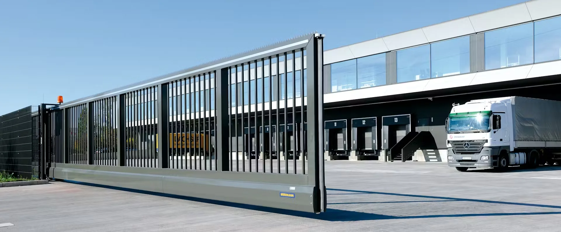 Sistemi esterni senza guida a terra, ideali per aree industriali e logistiche. Garantiscono fluidità di movimento e massima sicurezza perimetrale.